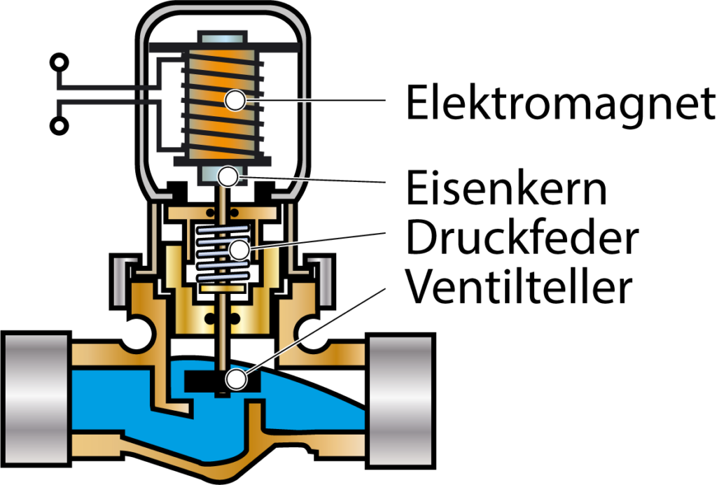Mit einem Elektromagnetventil wird ein Stoffdurchfluss gesteuert. Im Grundzustand ist das Ventil durch die Feder geschlossen. Bei Stromfluss wird der Eisenkern gegen die Federkraft in die Magnetspule gezogen und öffnet das Ventil. Bei Stromausfall ist der Stofffluss sicher unterbrochen.